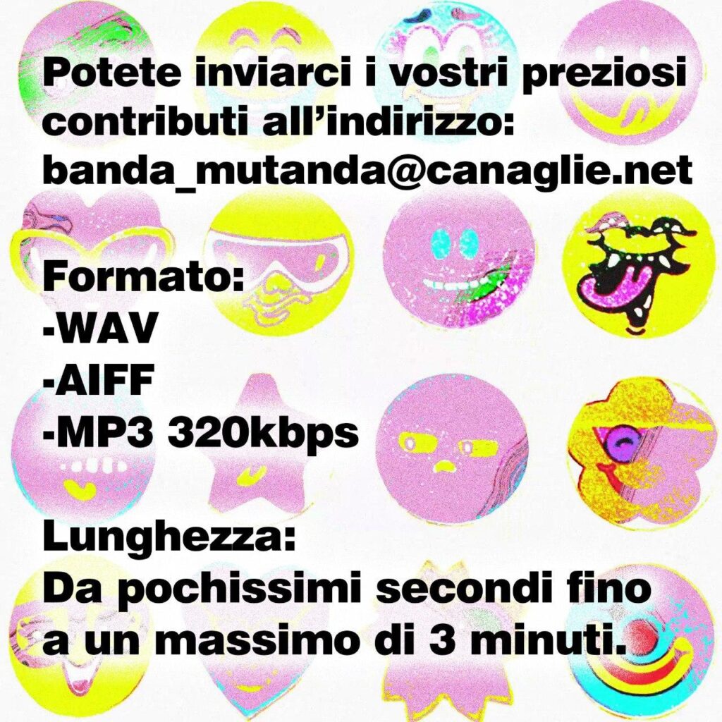 Potete inviare i contributi audio (WAV o MP3 qualità minimo 320k, da piccoli skits a un massimo di 3minuti) a banda_mutanda(at)canaglie.net